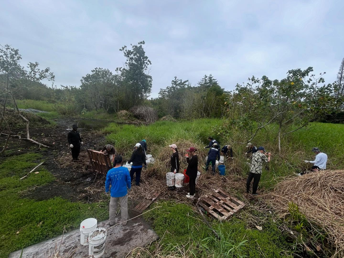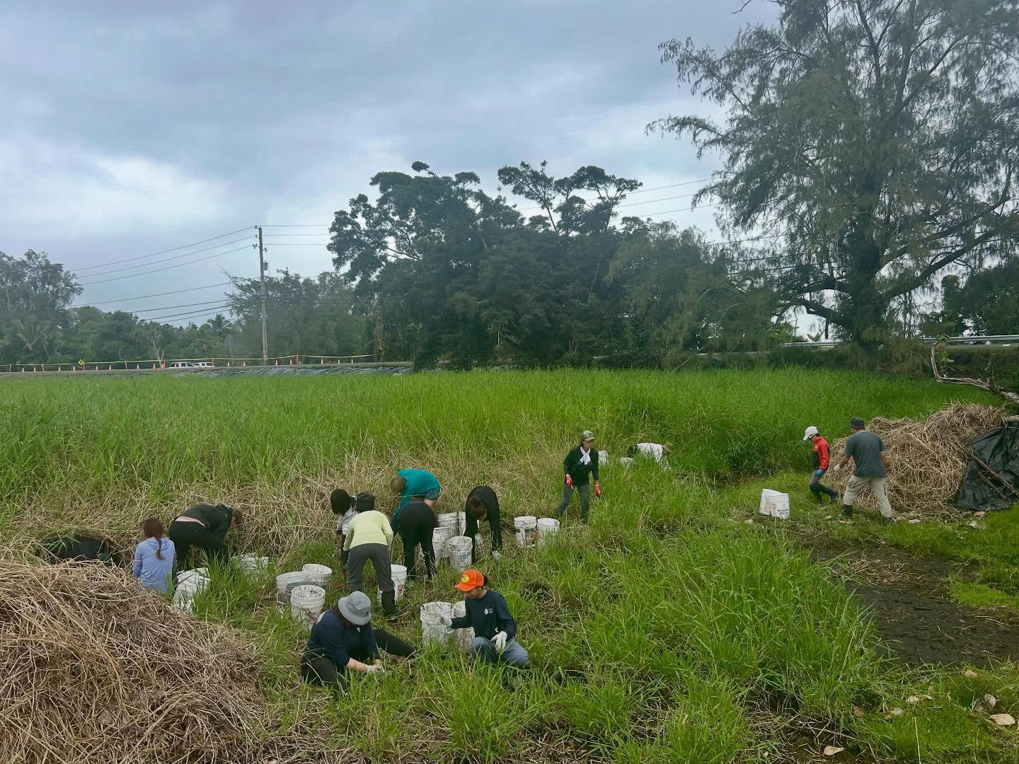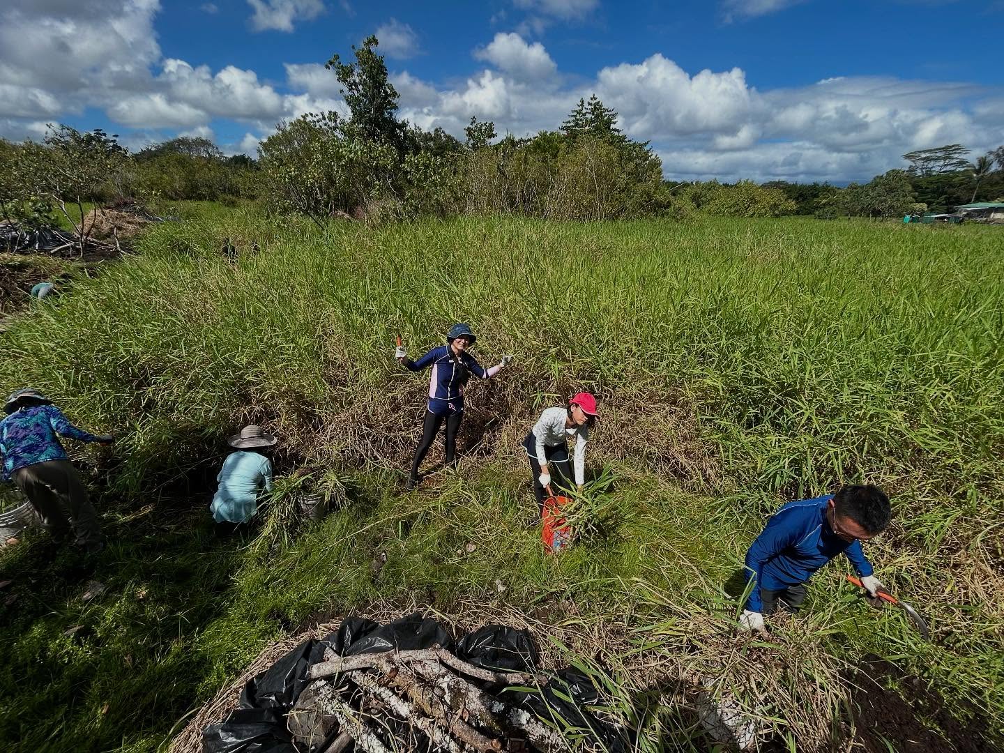 Lokowaka’s dedicated volunteers were joined by new community members, UH Hilo Bonner Leaders, visitors from Oʻahu, and students and professors from Ryukoku University’s Department of Agriculture in Japan. Together, their caring hands made a big impact in clearing invasive California grass.