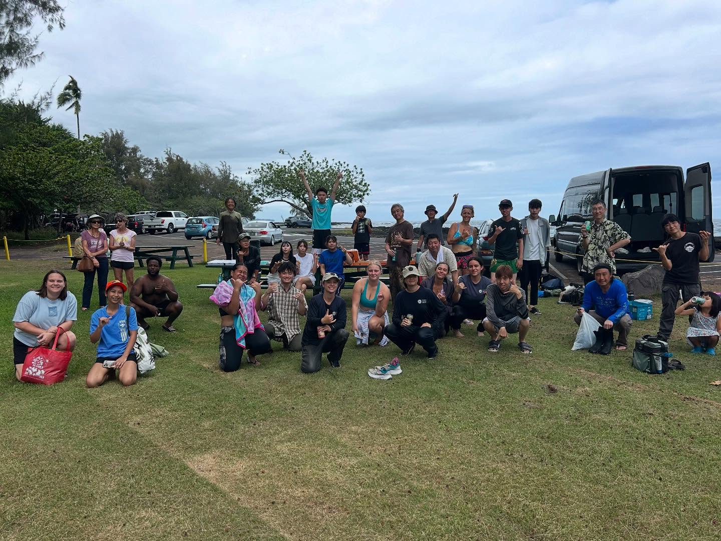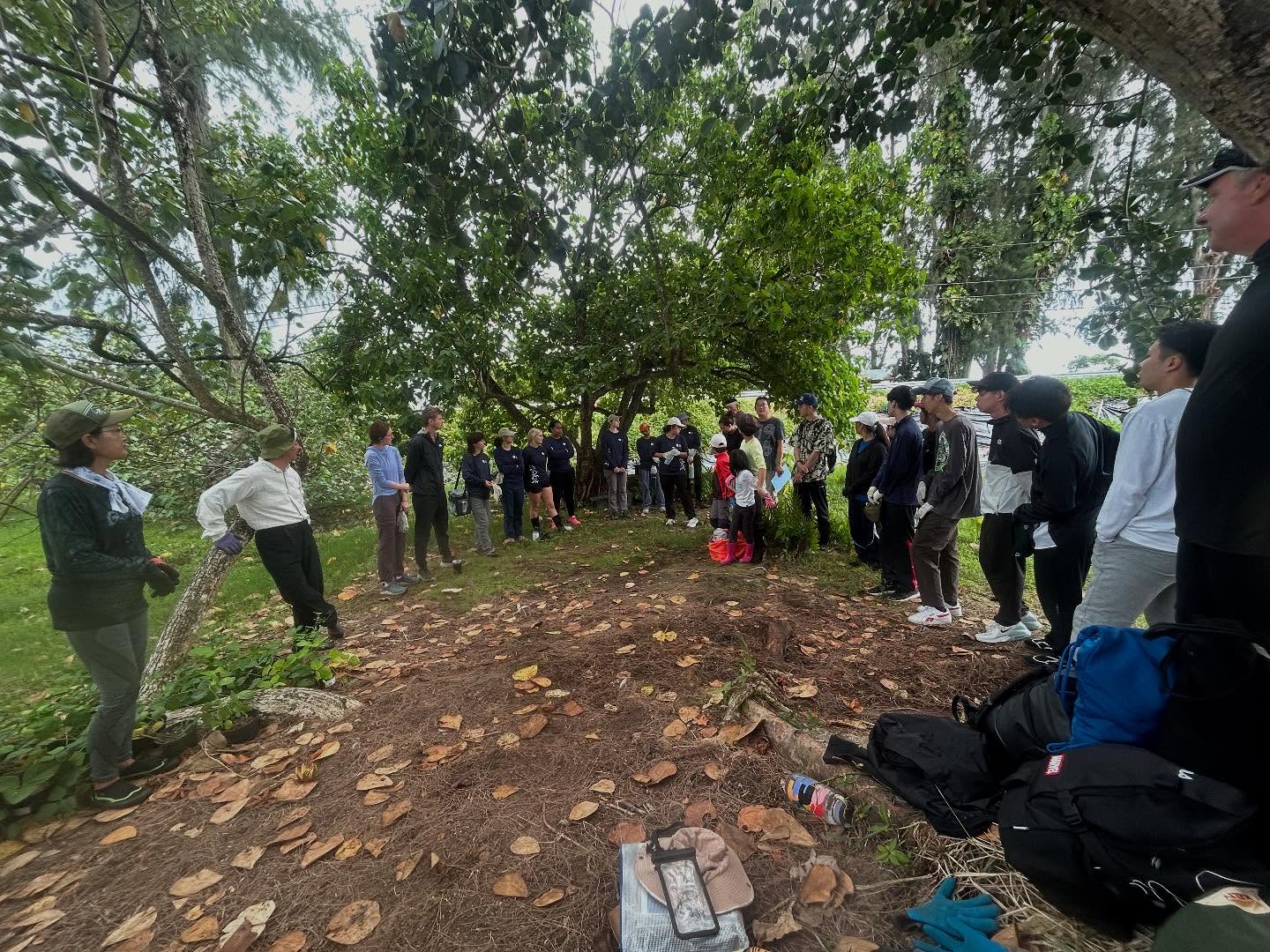 今日のロコワカの活動には、常連ボランティアに加えて、新しい地元のボランティア、ハワイ大学ヒロ校のボナーリーダーたち、オアフ島からのボランティアたち、そして日本の龍谷大学農学部の学生と教授の皆さんが参加してくださいました。大勢の皆さんの温かい協力により、外来種カリフォルニアグラスの除去がかなり捗りました。