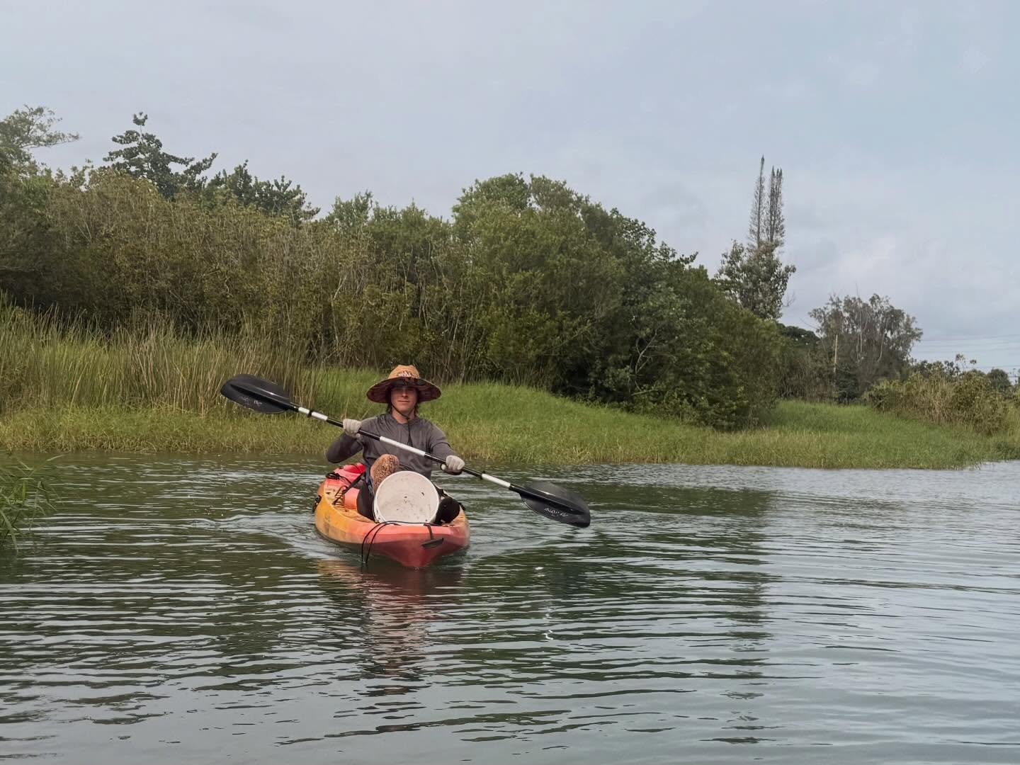 前日から続ける予定だった作業場所へカヤックで向かう途中、2羽のネーネーが私たちと競うかのように飛んできました。私たちより先にその場所に着いたので、ネーネーからの導きとして、私たちは別の場所で作業をすることにしました。維持管理のための草取り作業に加え、新たに草を刈り取り・抜き取ったところは、実は池の一部であるということがわかり、今後は潮が満ちてくると、そこに水が流れます。今日もまた素晴らしい作業日となりました。