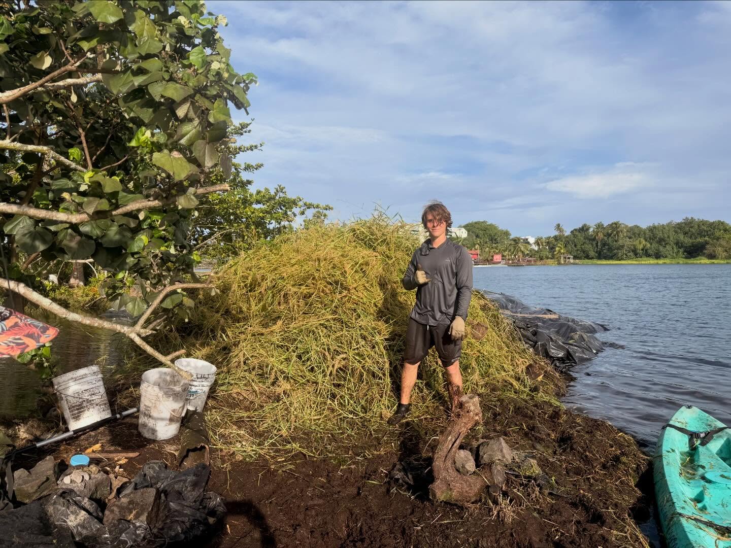 GIVEボランティアの皆さん、ワシントン州からの旅行者、そして地域のメンバーが一緒に力を合わせ、カリフォルニアグラスの除去や、以前に伐採した木々と新たに伐採した木々を運ぶ作業に取り組みました。1年前は、この場所には足を踏み入れることさえできませんでした。私たちはカリフォルニアグラスが密に生い茂る環境を、少しずつ区画ごとに刈り払い、道を切り開いてきました。ここにたどり着けるようになってからは、侵略的外来種の木を一箇所ずつ伐採・除去し、今のような開けた空間が少しずつ生まれてきました。暑い中での懸命な作業とチームワークに、心から感謝します。
