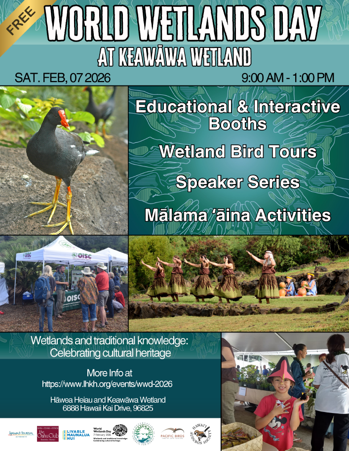 オアフ島のケアヴァーヴァ湿地で予定されていた世界湿地の日のイベントは中止となりましたが、私たちのアウトリーチチームは現地で野鳥観察を行いました。アラエ・ウラ4羽、マガモ5羽、コーレア1羽、アマサギ1羽、チョウショウバト2羽がいました。この小さな湿地は、近絶滅種(個体数が極めて減少している絶滅危惧種)であるアラエ・ウラにとって重要な生息地であり、小規模な湿地であっても欠かせない存在であることを教えてくれます。