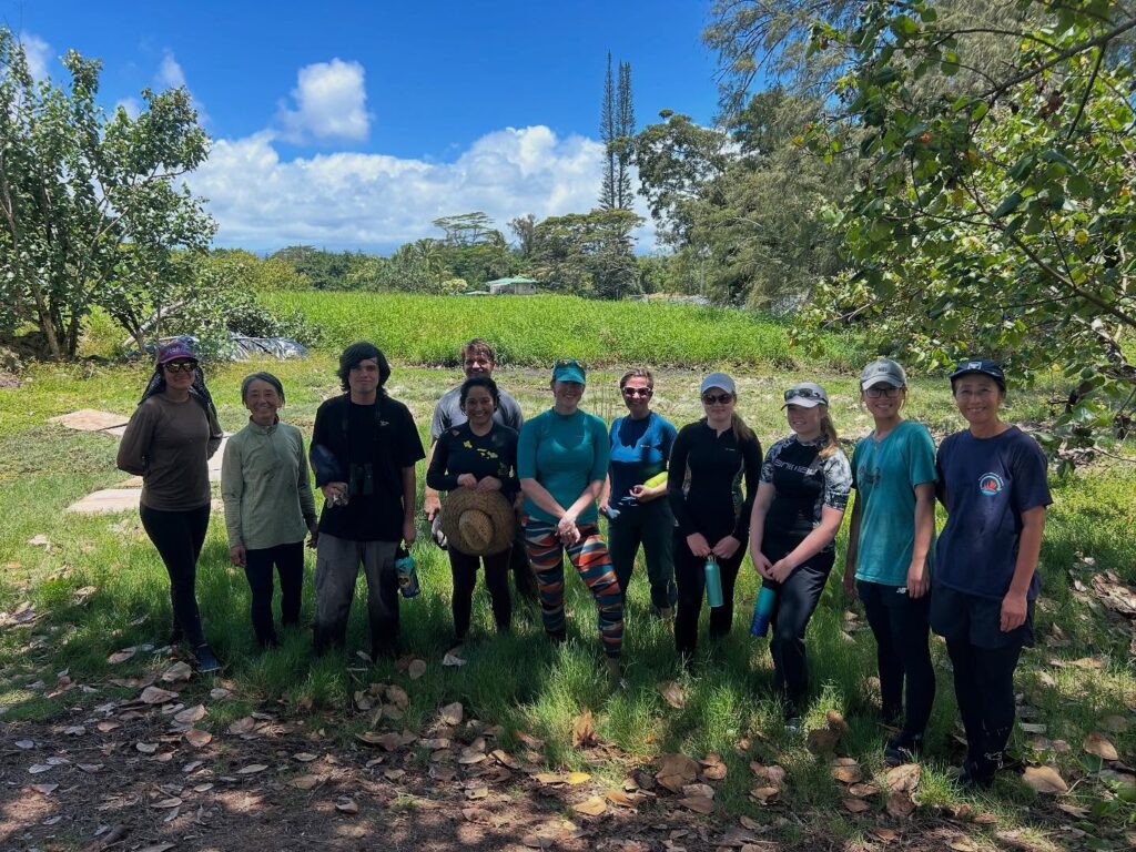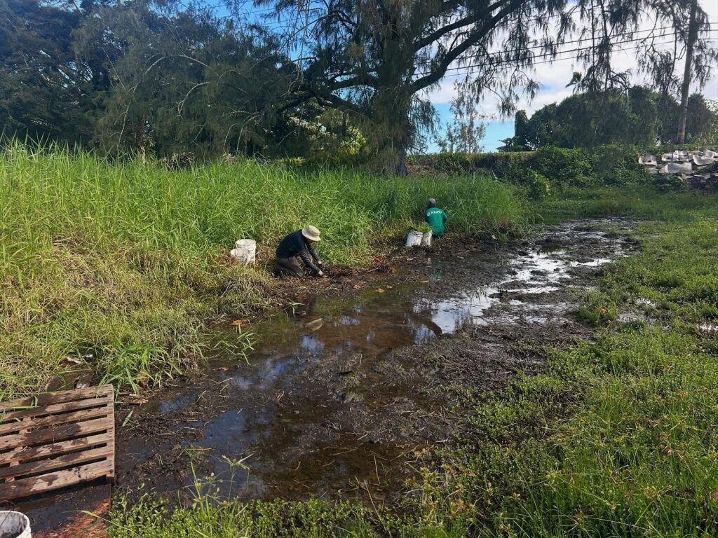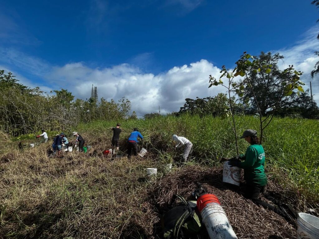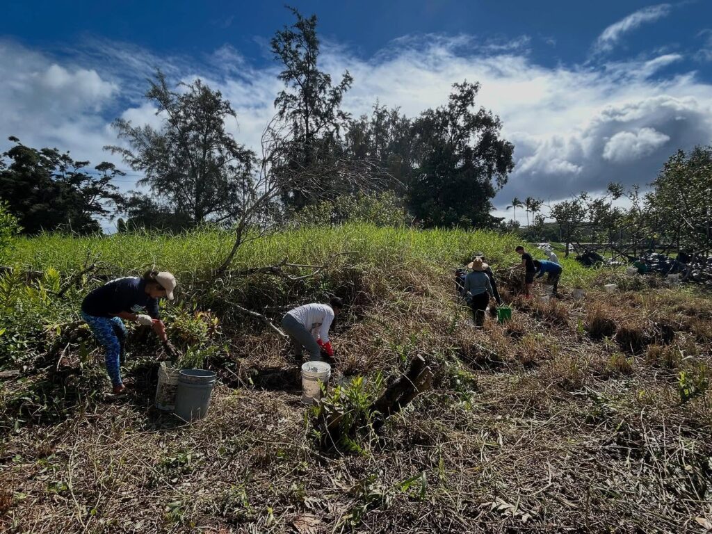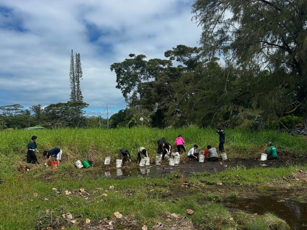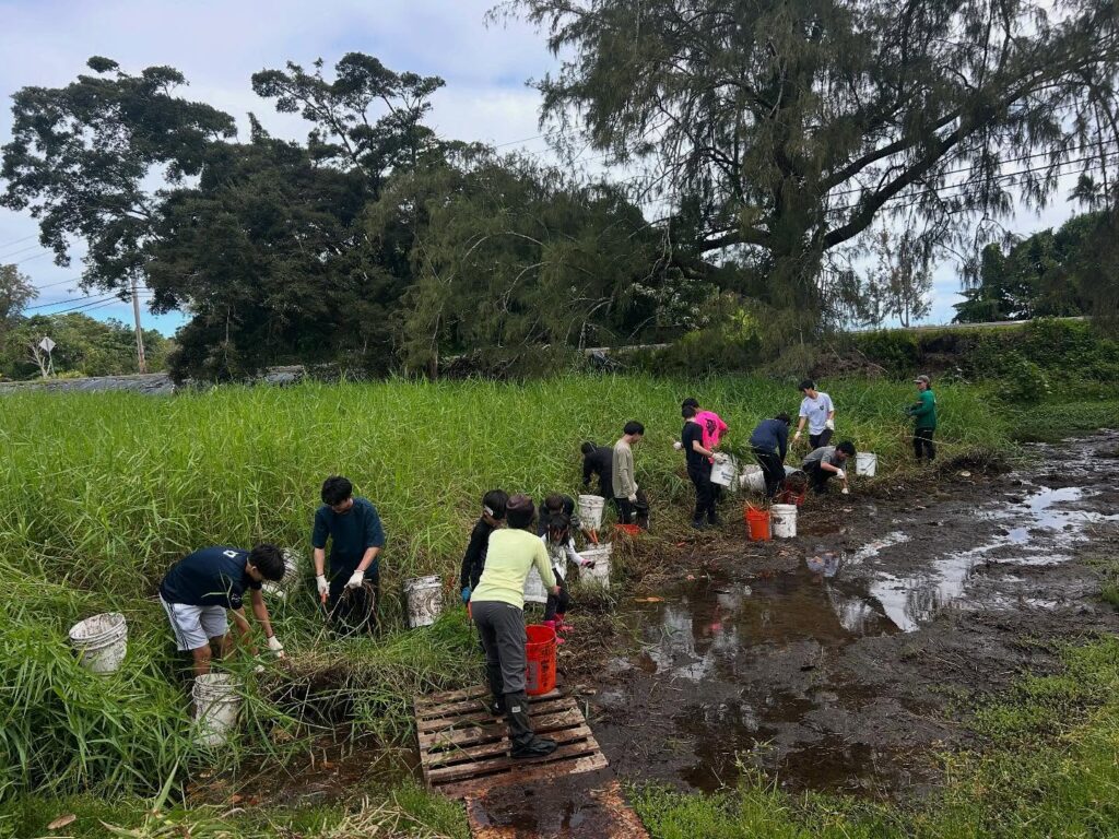 The morning began with our dedicated KUPU member, followed by a high school teacher visiting from Japan who came to learn about our work and joined us in the field. Later, a regular volunteer—a mother with her two young children—arrived, followed by members of the Waiākea High School Robotics Team and their friends.