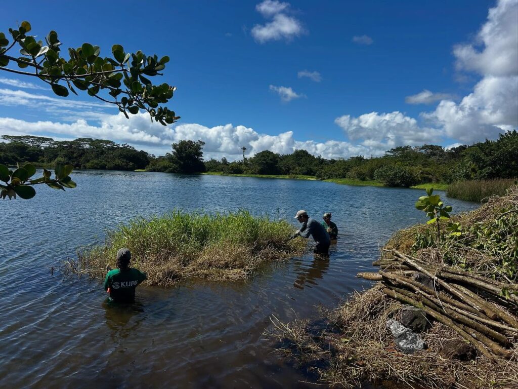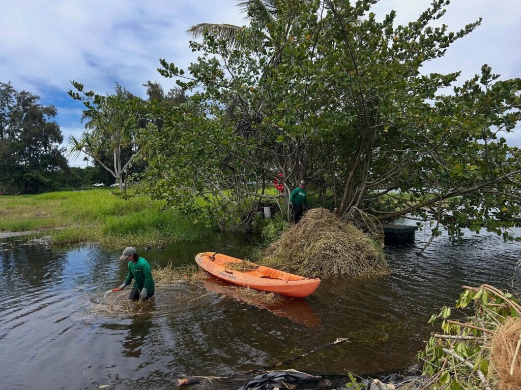 Kupu HYCCサマープログラムのメンバーとボランティアの皆さんの尽力により、今日は島の裏側で大きな進展がありました。水に根を張った大量のカリフォルニアグラス──満潮時にはかなり深い水の中にありながらも、背の高い茎が水面のはるか上まで伸びている──が、今ではたった二か所の小さなエリアにまで減りました。「小さい」といっても、以前の広がりと比べてのことです。残っている部分でさえ、取り除くには多くの時間と労力が必要です。